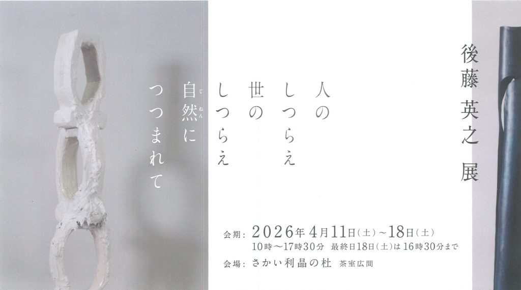 | 展覧会に寄せて 日本における茶の湯文化発生の地とも言える堺という場所で、三千家の茶室が一堂に会するという特別な場所であり、一歩中に入ると緊張と静寂を同時に体感するような場所、そんな非日常に自作を展示してみたい気持ちが強く動いた。 今回のテーマである「しつらえ」とは、室内の装飾という意味以外にも設ける、準備するという根源的な意味もあり〝心の準備が整う場所〟そんな理想を掲げ、三つの茶室を自然界に見立て、作品をいかに空間を呼応させ作品と茶室空間お互いの空間認識をいかに矜持できるかと言う事に力を注いだ。 そんな意味から作品内容も旧作の再制作や素材表現も多紀にわたっている。ぜひ非日常空間での作品世界に浸って頂ければ幸いである。 |