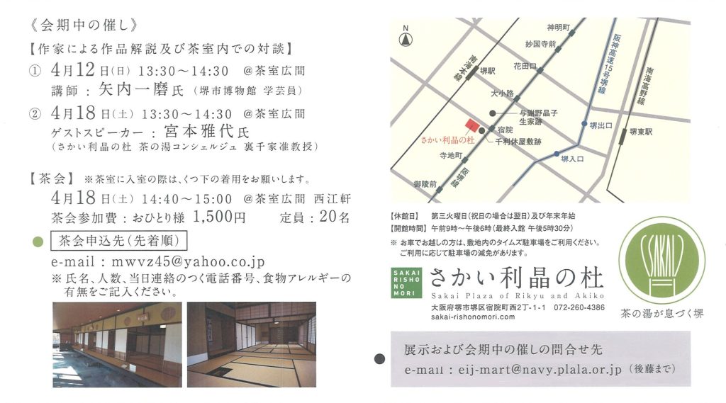 | 会 場 | さかい利晶の杜 1F茶室広間 場所:〒590-0958 大阪府堺市堺区宿院町西2丁1-1 堺市立歴史文化にぎわいプラザ内 電話:072-260-4386 |
