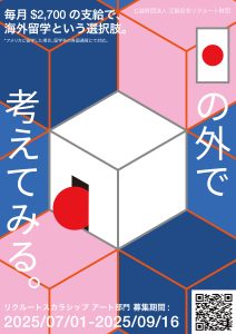 【奨学金制度「リクルートスカラシップ」とは】株式会社リクルート創業10周年の際に「社会への貢献」を目的に検討され、「リーダーシップのある人・向学心旺盛な人・将来何かやりそうな人」を応援するため1971年に創設されました。現在は、音楽、スポーツ、アート、学術の分野において世界に挑戦し、ずば抜けた活躍をしそうな日本の若者を応援しています。【リクルートスカラシップ アート部門について】美術作家として作品制作を通じて社会に貢献することを目指し、海外大学·院に進学する24歳以下の方を対象とした返済不要の給付型奨学金です。合格後は2年間奨学金を受給することができ、その後も毎年行われる更新審査に合格すると27歳まで奨学金が支給されます。海外の美術大学等の教育機関への留学支援を通じて、作家として世界でずば抜けた活躍を志す人材を応援します。詳細は「募集ページ」URLからご確認ください。 募集期間2025年7月1日~2025年9月16日支給期間2026年4月 ~ 2028年3月金額(月額)アメリカ 2,700ドル、イギリス 2,000ポンド、EU諸国 2,300ユーロ ※留学先により異なります。※何れも返済義務はありません。※上記通貨以外の国へ留学する場合、財団の定める現地通貨額にて支給します。採用人数2名程度募集ページ2026年度リクルートスカラシップ アート部門 募集要項ニュースリリース海外美術大学への留学奨学金 「リクルートスカラシップ アート部門」7月1日より募集開始!