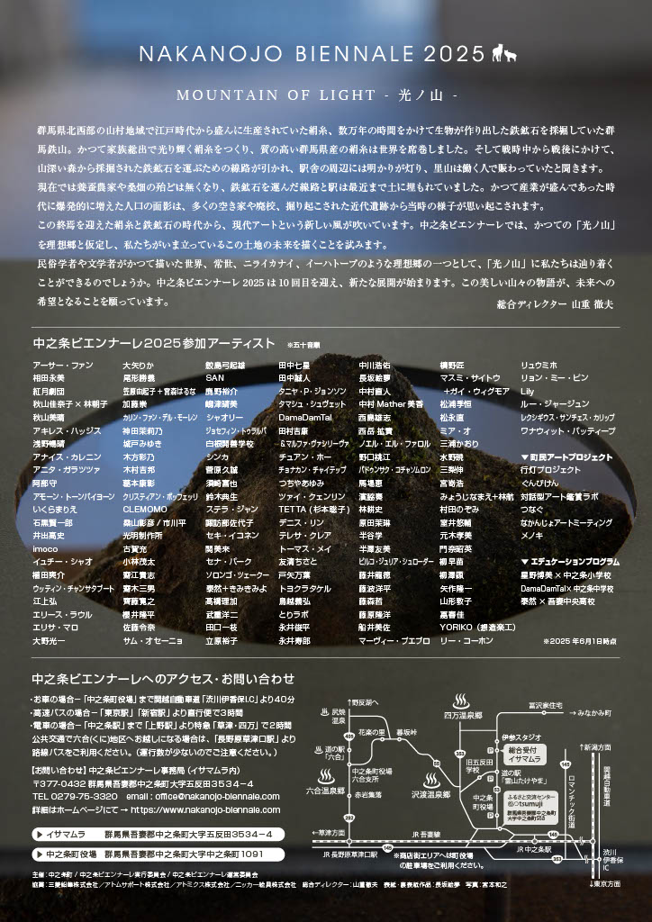 この度、第10回を迎える中之条ビエンナーレ2025では、国内外から創造的、革新的なアイデアやプロジェクトを持つ多分野のアーティストが作品を展示します。