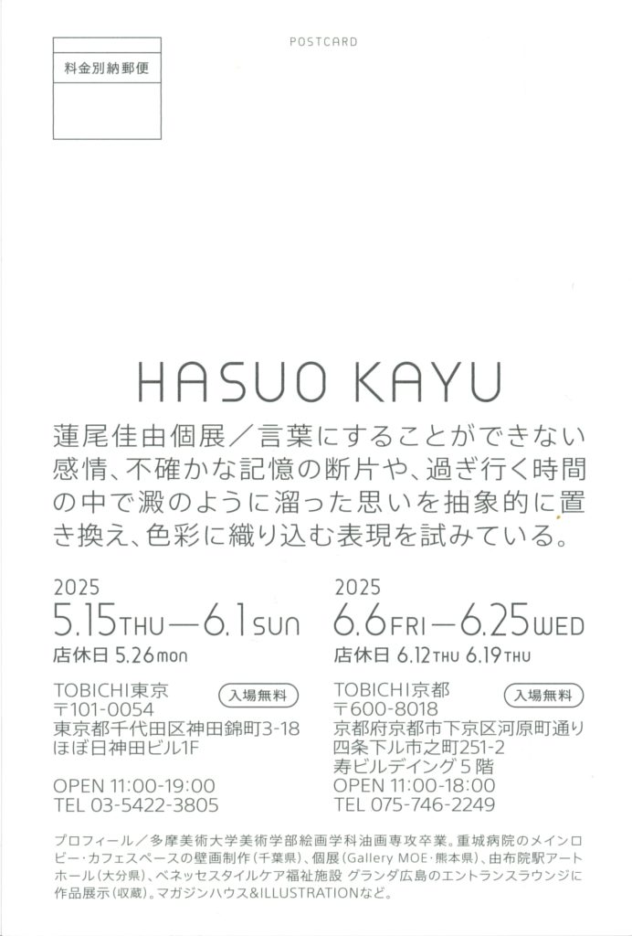 言葉にすることができない感情、不確かな記憶の断片や、過ぎ行く時間の中で澱のように溜まった思いを抽象的に置き換え、色彩に織り込む表現を試みている。