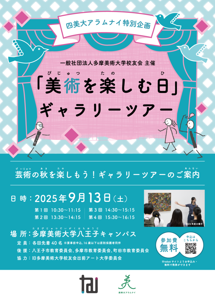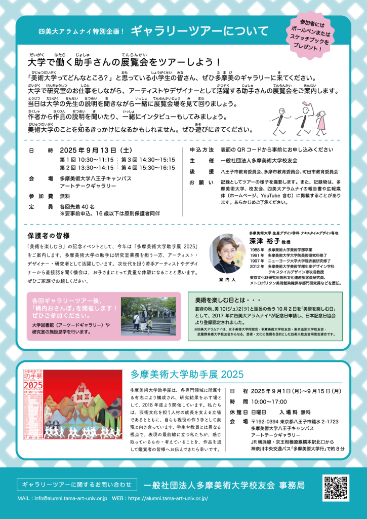 | 女子美術大学同窓会・多摩美術大学校友会・東京造形大学校友会・武蔵野美術大学校友会からなる四美大校友会同窓会連合です。 |