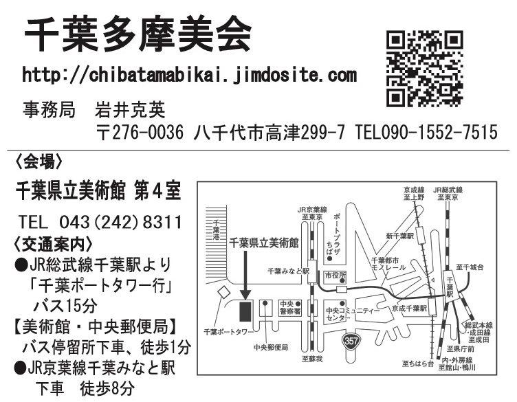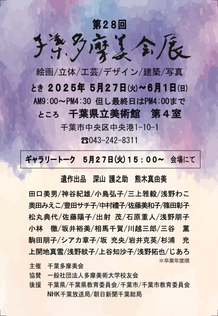 | 団体名 | 「千葉多摩美会」 田口美男(1961年美術学部卒業) 神谷紀雄(1963年美術学部卒業) 小島弘子(1963年美術学部卒業) 三上雅毅(1964年美術学部卒業) 浅野わこ(1968美術学部卒業) 奥田みえこ(1969年美術学部卒業) 豊田サチ子(1970年美術学部卒業) 中村禮子(1971年美術学部卒業) 佐藤美和子(1975年美術学部中退) 篠田彰子(1976年美術学部卒業) 松丸典代(1978年美術学部卒業) 佐藤陽子(1978年美術学部卒業) 出射茂(1978年美術学部卒業) 石原重人(1980年美術学部卒業) 浅野朋子(1983年修士課程修了) 小林徹(1982年美術学部卒業) 坂井裕美(1981年美術学部卒業) 相馬千賀(1982年美術学部卒業) 川越三郎(1984年修士課程修了) 三谷薫(1988年美術学部卒業) 駒田朋子(1990年美術学部卒業) シアカ章子(1985年美術学部卒業) 坂充央(1991年美術学部卒業) 岩井克英(1993年美術学部卒業) 杉浦充(1999年修士課程修了) 上開地真雪(2001年美術学部卒業) 浅野紋子(2002年美術学部卒業) 上谷知沙子(2008年美術学部卒業) 浅野拓也(2016年修士課程修了) じあろ(修士課程在学生) 【遺作出品】 深山護之助(1967年美術学部卒業) 熊木真由美(1969年美術学部卒業) |