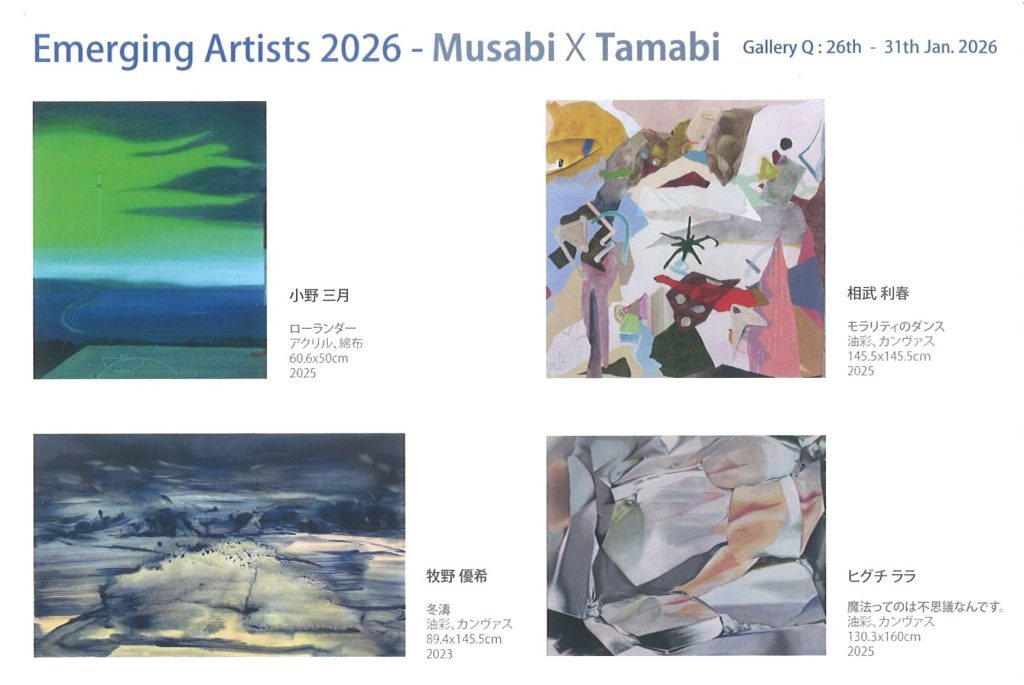 2025年12月23日 EVENT, MOURNING 出品者牧野 優希 (博士課程在学生)ヒグチ ララ (美術学部在学生)他2名日 程2026年1月26日(月)~2026年1月31日(土)時 間11:00〜19:00 (最終日17:00)場 所ギャラリーQ東京都中央区銀座1-14-12 楠本第17ビル3階WEBギャラリーQReception forartists2026年1月26日(月)18:00~問合せcontact@galleryq.info 大渕 花波 個展「おばけのヴォルフ」 輝け!! いのち君 深津真彩 個展「Moments 23/24」 展覧会