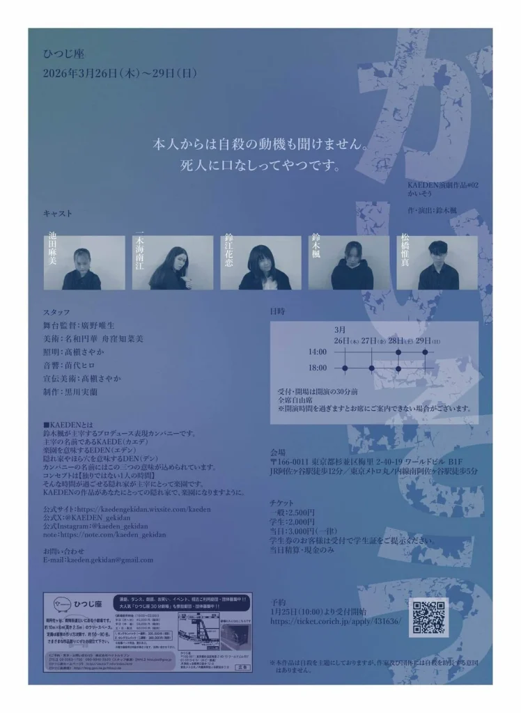 | 入場料 | 一般:2,500円 学生:2,000円 当日:3,000円(一律) 当日精算・現金のみ KAEDEN「かいそう」予約ページ |