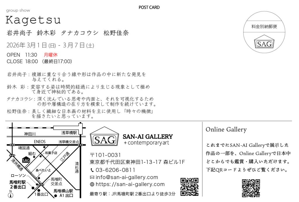 | 場所 | SAN-AI Gallery 住所:東京都千代田区東神田1-13-17 森ビル1F 電話&FAX:03-6206-0811 |