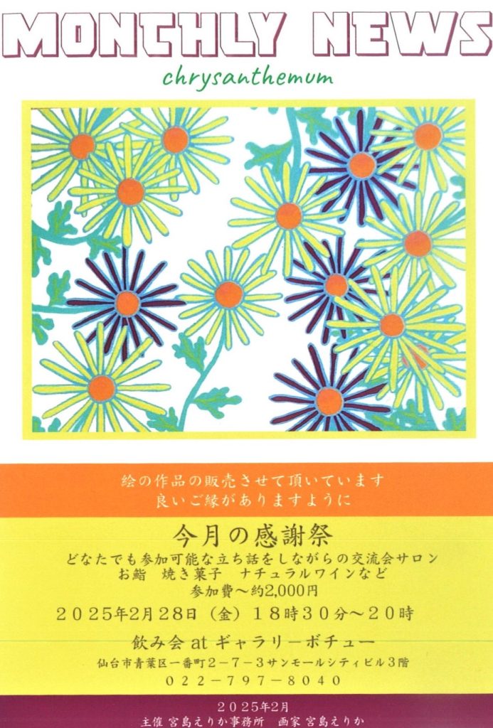 2025年2月25日 EVENT 出品者宮島えりか(2010年美術学部卒業)日程2025年2月28日(金)時間18:30~20:00参加費~約2000円場所ギャラリーボチュー宮城県仙台市青葉区一番町2-7-3サンモールシティビル3階WEBギャラリーボチュー 【上映】コニカミノルタプラネタリウム「猫星夜 -ある日の星空のおはなし-」 ひらめき☆ときめき サイエンス「成長することば─不思議なオノマトペの世界を絵本で表すワクワク体験講座!」 ひらめき☆ときめき サイエンス「古布を刺し子でリサイクルしながらSDGsについて学ぼう」 イベント