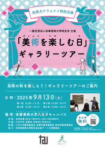 多摩美術大学創立90周年記念事業 The Tama Art University Graphic Arts Course Year-End Exhibition 開   期2025年11月21日(金) 〜 2025年11月28日(金) ※22日(土)は総合型選抜のため、外部からのご来場はできません。時   間10:00〜17:00休 廊 日11月22日(土)・23日(日)会   場多摩美術大学 八王子キャンパス 絵画北棟・東棟内   〒192-0394 東京都八王子市鑓水 2 丁目 1723   絵画北棟ギャラリー(絵画北棟エントランス)   絵画東棟ギャラリー( 絵画東棟1・2 階 )   GAS(絵画北棟 1階) ア ク セ スJR 横浜線・京王相模原線橋本駅北口から神奈川中央交通バス     「多摩美術大学行」で約8分。     または、JR八王子駅南口から京王バスで約20分U  R  L詳細はこちら関連イベント「グラフィックデザインにおける「版」を考えるプロジェクト」日時|2025年11月21日(金) 13:10〜14:40場所|レクチャーCホール  講師|西村 祐一(グラフィックデザイナー)  主 催多摩美術大学版画研究室(042-679-5621 / hanga@tamabi.ac.jp) 今年も本学版画専攻3年生と大学院 1年生による進級制作展を本学八王子キャンパスの絵画学科ギャラリー(3会場)で開催します。 次年度の卒業修了制作展に向けた中間発表会としての展覧会です。本学版画専攻の多彩で、活発な教育研究の過程をぜひともご覧ください。